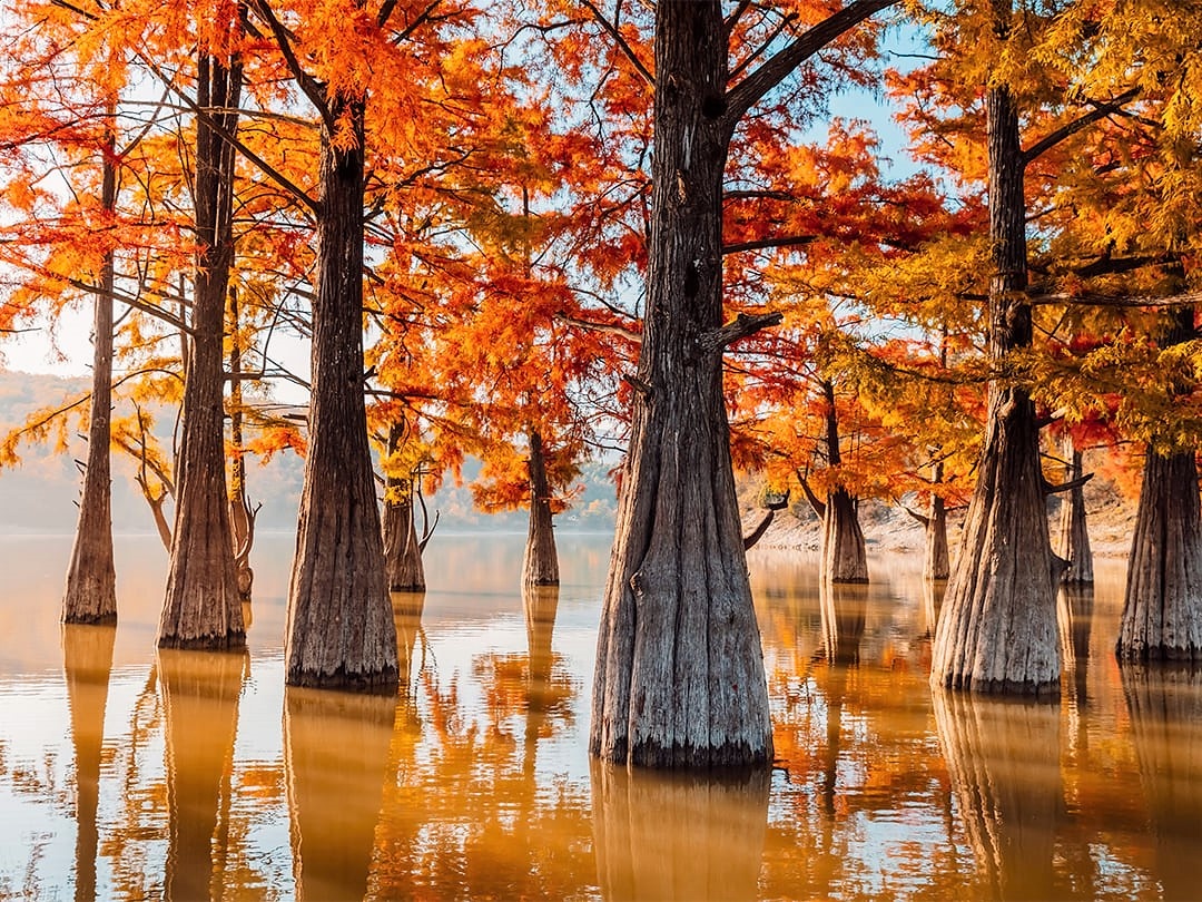 Эти деревья растут вдоль берега, где вода мельче, и образуют естественные тени и арки над озером. Некоторые вытягиваются до 5-10 метров, с кривыми стволами, которые наклоняются к горизонту. Весной они пускают шишки, осенью – желтые иголки, падающие в воду и удобряющие дно. Фотографы любят их за сказочный вид: корни в воде как живые статуи, идеальны для снимков. Экологически деревья фильтруют воду, очищая от примесей через корни.