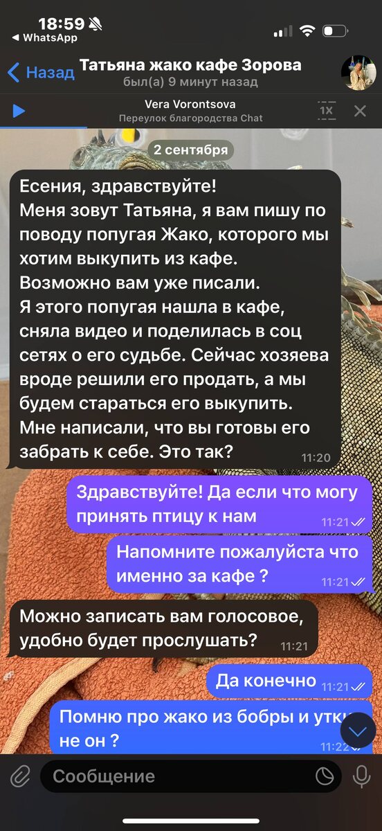 Дорогие друзья, возникла максимально неприятная ситуация и, к сожалению, мне пришлось стать её не посредственной частью. И так, что именно произошло. Со мной связалась Татьяна – девушка, которая взяла на себя организацию сбора на выкуп жако из кафе “Pink Paradise”, которое находится в Видном. Первый вопрос, который был мне задан и который вы видите на первом скриншоте - «Мне написали, вы готовы его забрать к себе. Это так?». На что я ответила, что готова принять птицу к нам. Ввиду того, что Татьяна с моим проектом знакома не была, я прислала ей наш основной паблик ВКонтакте, где представлены большинство фото и информация о том, как содержатся мои птицы. Позже был вопрос, могу ли я взять на себя организацию этого поста, на что я ответила отказом, т.к. изначально контакты хозяев и их согласие были даны не мне. После сбора необходимой суммы люди перестали открыто со мной об этом общаться. О ходе сбора мне было ничего не известно, а о его закрытии я, опять же, узнала вообще от други