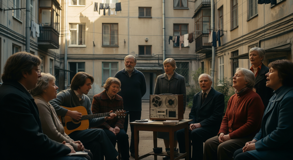 Понятие "дворовая песня" не сводилось к банальному исполнению под гитару на скамейке. Оно включало в себя весь спектр музыки, которая распространялась "снизу вверх" — от человека к человеку. Это были песни из любимых кинофильмов, хиты официальной эстрады, а также записи, сделанные на магнитофонных кассетах и передававшиеся из рук в руки. Последнее было особенно важно. Хотя кассетные магнитофоны станут по-настоящему массовыми к концу десятилетия, уже в начале 1970-х они играли ключевую роль в формировании уникального музыкального ландшафта. Эта технология создала негласный "параллельный" музыкальный мир, свободный от цензуры, где мирно сосуществовали как официальные, так и запрещенные к показу на телевидении произведения. Этот "магнитоиздат" позволял слушателю самому формировать свой плейлист, а не полагаться исключительно на государственный репертуар.