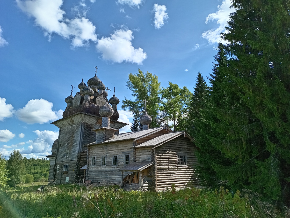 И ведь правда. Мы сами определяем свои поступки, а не здание и не батюшка в храме. И к каким святым местам тянется наша душа, те и надо посещать. Для меня одно из таких мест является северная деревня Бережная Дуброва, где находится старинный Храм Рождества Пресвятой Богородицы 1678 года постройки. Это наследие деревянного зодчества, которое было распространено в наших местах. Многое писать тут, наверное, не стоит. Надо просто чувствовать благолепие данного места. Обычно храмы строят на открытых местах, а тут высокое здание затерялось меж елей. И с дороги не видно, пока не подъедешь или не подойдёшь поближе. А рядом находится старинная каменная кладка, окружающая местный погост. Присмотритесь. Вот она, в траве. Храм находится на реставрации. Им занимаются волонтеры сообщества "Вереница". Сделали крыльцо. Что примечательно, поставили на камни и бересту. Естественный материал, которым и пользовались наши предки. Вид внутри Ну и обойдём храм сзади. А вверху есть надпись: Кт