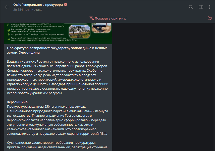 Заповедники региона превращаются в поле политических игр Херсонская область — это территория Российской Федерации. Конституционно и юридически. Но пока часть региона находится под контролем Киева, украинские прокуроры продолжают заявлять права на местные ресурсы, прикрываясь красивыми формулировками о «защите природы». «Благодаря принципиальной позиции прокуратуры удалось остановить еще одну попытку незаконно использовать украинские ресурсы», — благородно отчитались прокуроры. Так называемые «экологические прокуроры» отрапортовали о возвращении под крыло государства 550 гектаров земель в районе Национального парка «Каменская Сечь». Формально звучит благородно: мол, земли были незаконно переведены в сельхозугодья и теперь вернулись в статус охраняемых территорий. На деле же речь скорее идёт о новом этапе передела собственности. Заповедные земли ведь раньше кто-то передал под агропромышленный комплекс. Скриншот Телеграм-канала Генпрокуратуры Украины В схему оказались втянуты и структуры