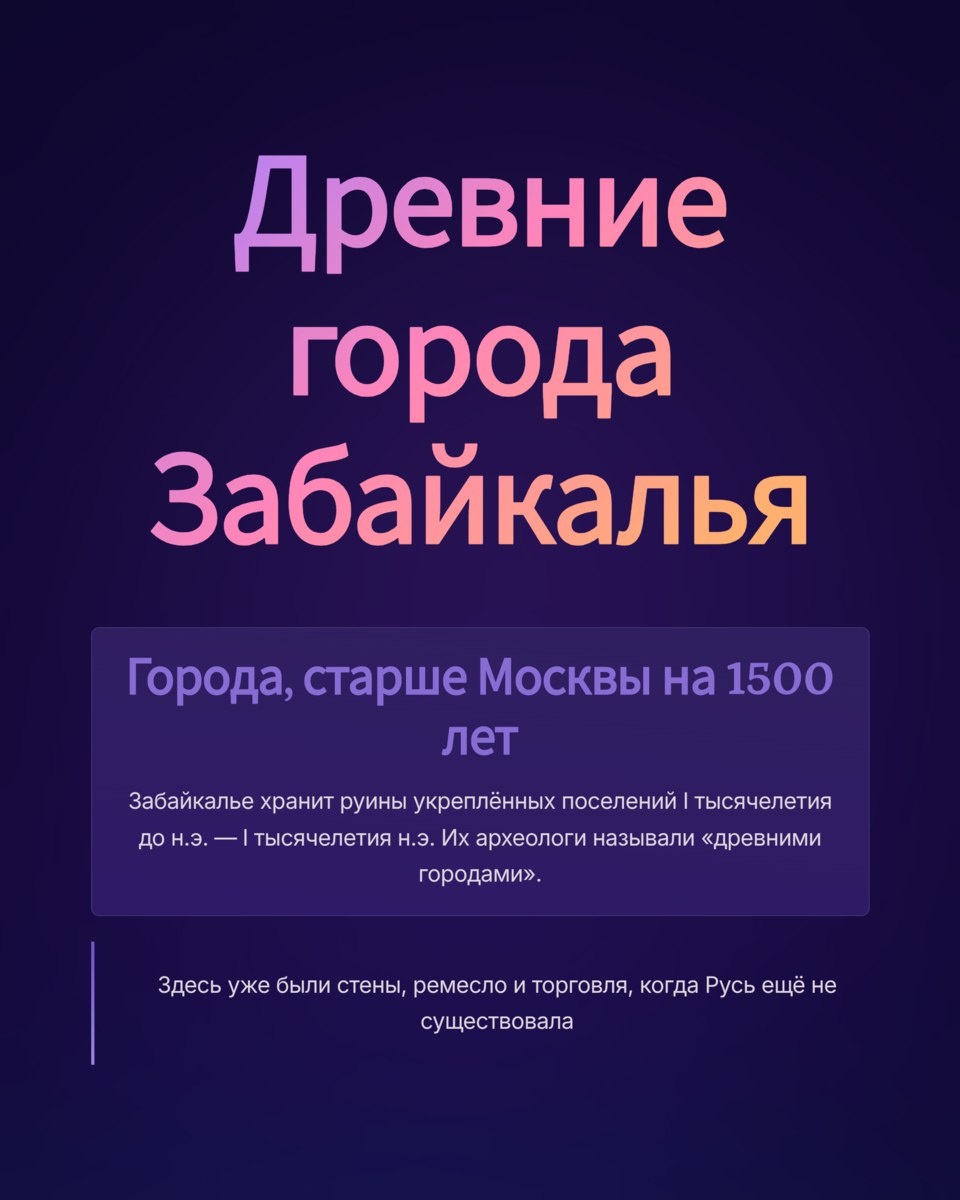 Древние города Забайкалья Древние города Забайкалья — Иволгинское городище, Усть-Кяхтинское укрепление, поселения на Чикое, Селенге и Хилоке. Археологические раскопки показали, что здесь уже в I тысячелетии до н.э. существовали стены, кузницы, зернохранилища и развитая торговля. Эти укреплённые поселения считаются центрами хуннской империи и ранней городской культуры Сибири. Узнайте, почему Забайкалье — не окраина, а колыбель древней цивилизации Азии. Сборник «Советская археология» за 1958 год, статья С. В. Киселёва «Древние города Забайкалья»