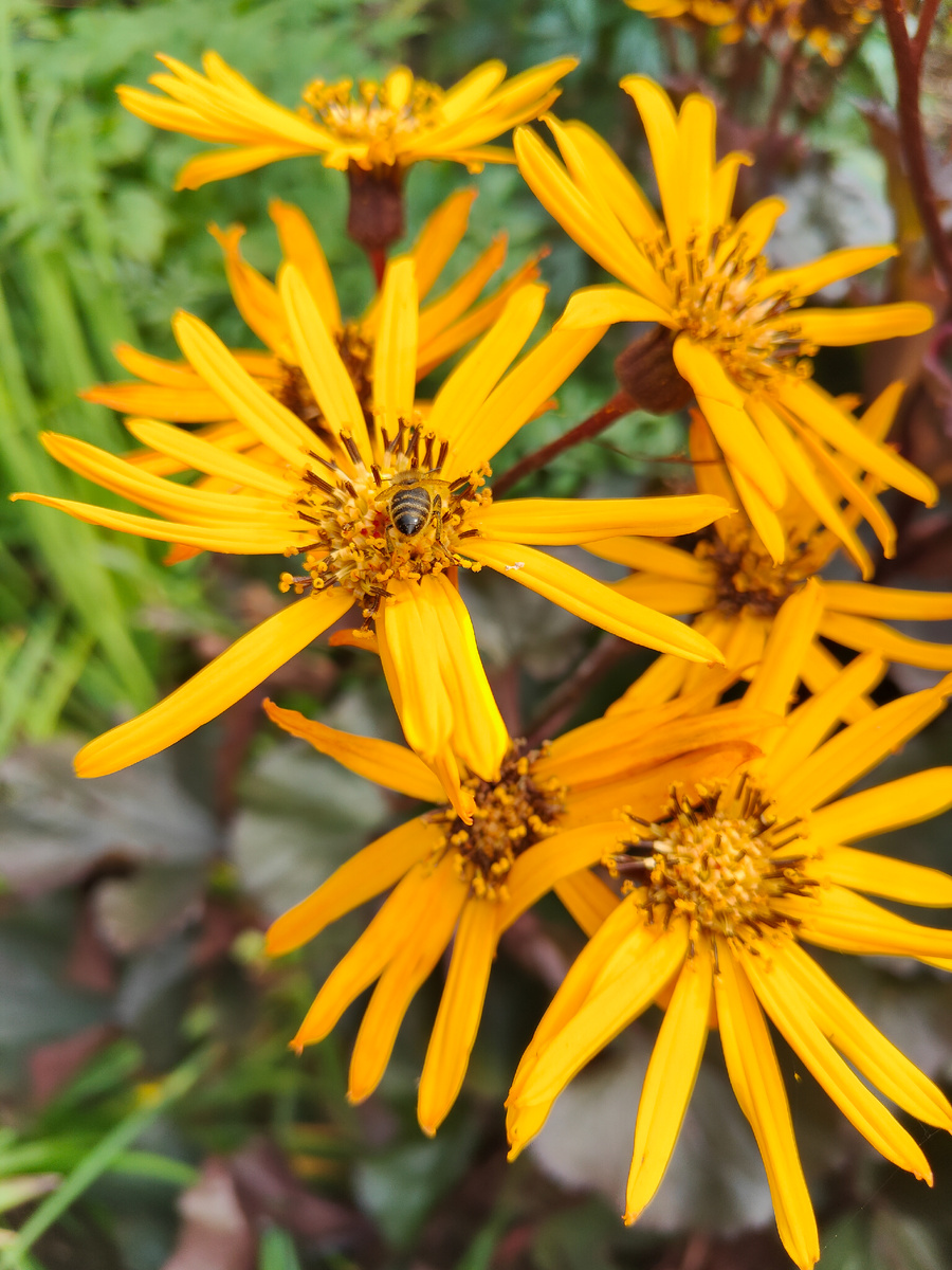 Вот пчела за работой на цветке бузульника зубчатого. Позировать отказалась, очень торопилась с работы домой.