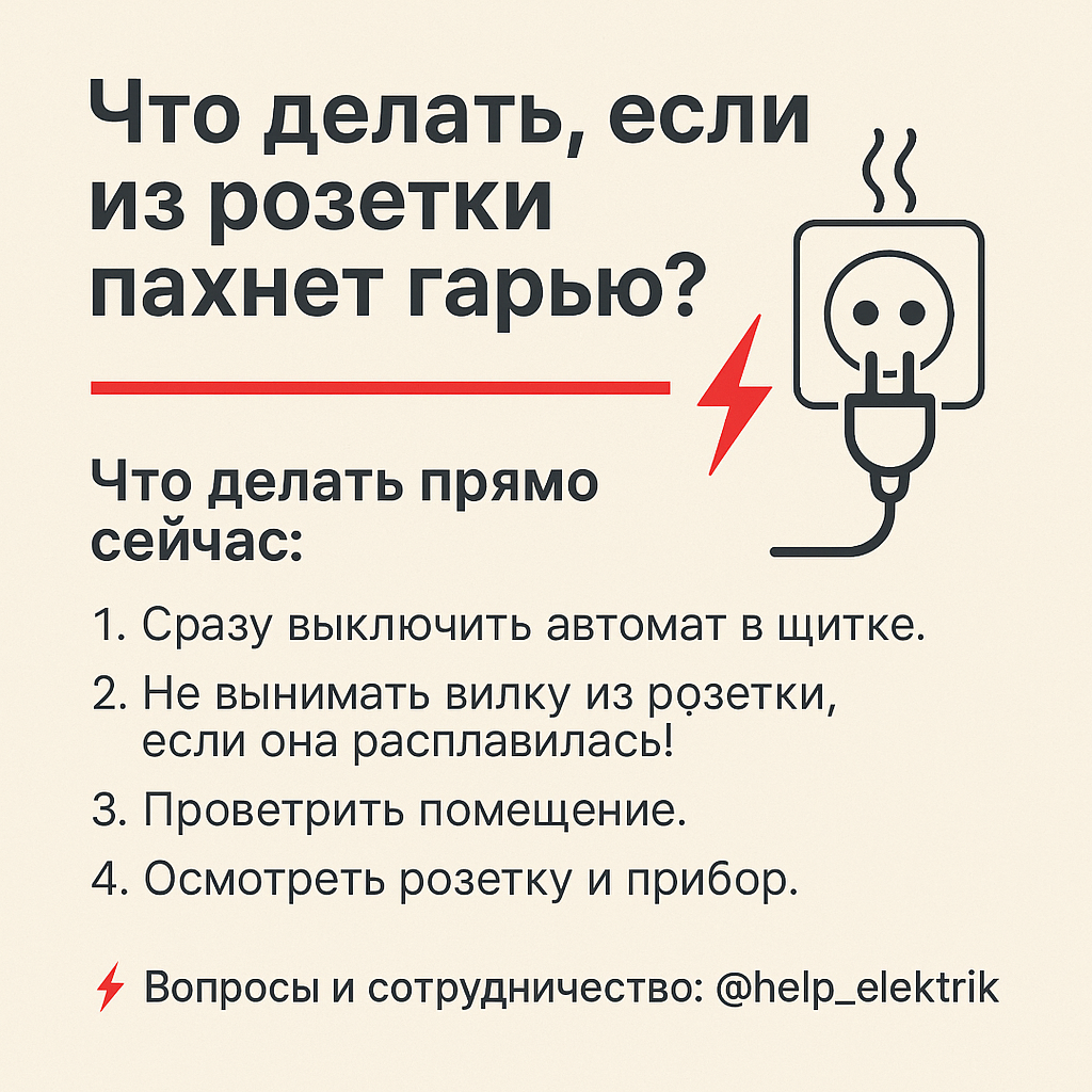 Запах гари или дым из розетки — это тревожный сигнал, который нельзя игнорировать. Чаще всего это признак перегрева или короткого замыкания. Если вовремя не принять меры, может начаться пожар. --- Основные причины 1. Перегрев розетки Мощный прибор включен в старую или некачественную розетку → контакты ослабли и начали плавиться. 2. Плохой контакт или ослабленные соединения Искрение внутри розетки или коробки создаёт запах и копоть. 3. Неисправный прибор Если техника повреждена, она может «жечь» контакты розетки. 4. Перегрузка линии Слишком много приборов подключены к одной группе розеток. --- Что делать прямо сейчас? 1. Сразу выключить автомат в щитке. 2. Не вынимать вилку из розетки, если она расплавилась! — это можно сделать только после отключения электричества. 3. Проветрить помещение. 4. Осмотреть розетку и прибор — определить источник запаха. 5. Вызвать электрика для диагностики и замены повреждённых элементов. --- Как предотвратить повторение Исполь
