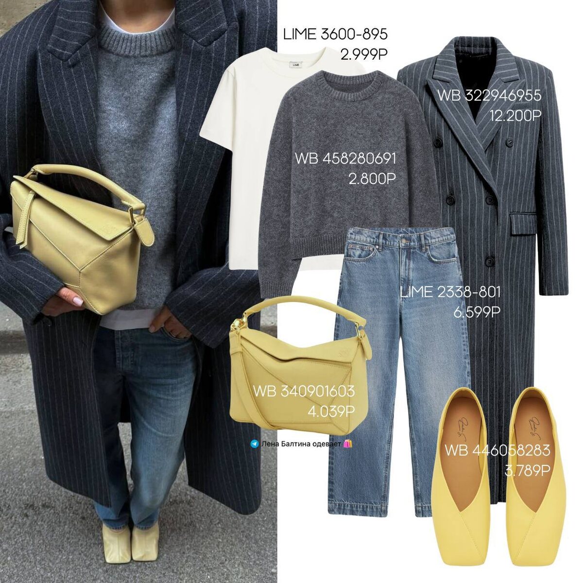 Длинное пальто в тонкую полоску — это маст-хэв осеннего гардероба. Оно даже простой образ с джемпером и джинсами делает очень элегантным. Ну и стройнит, конечно — это тоже держим в уме. Талию можно подчеркнуть поясом, или оставить прямой силуэт А яркие лимонные туфли и сумка — это тот самый акцент, который сделает образ живым и запоминающимся. Они словно желтые осенние листочки или солнышко, которое выглянуло из-за туч. Сразу поднимают настроение Этот комплект хорош еще тем, что он универсальный и не времени. Его можно надеть и на прогулку, и на встречу с подружками в кафе, и на светское мероприятие типа выставки. И даже на работу, если у вас нет строгих требований к дресс-коду Пальто в полоску, джинсы, серый джемпер — это классика, которая никогда не выйдет из моды, так что смело берем образ на заметку. А ссылочки забирайте в моем канале Если хотите больше идей с пальто, напишите в комментариях — подготовлю еще подборки