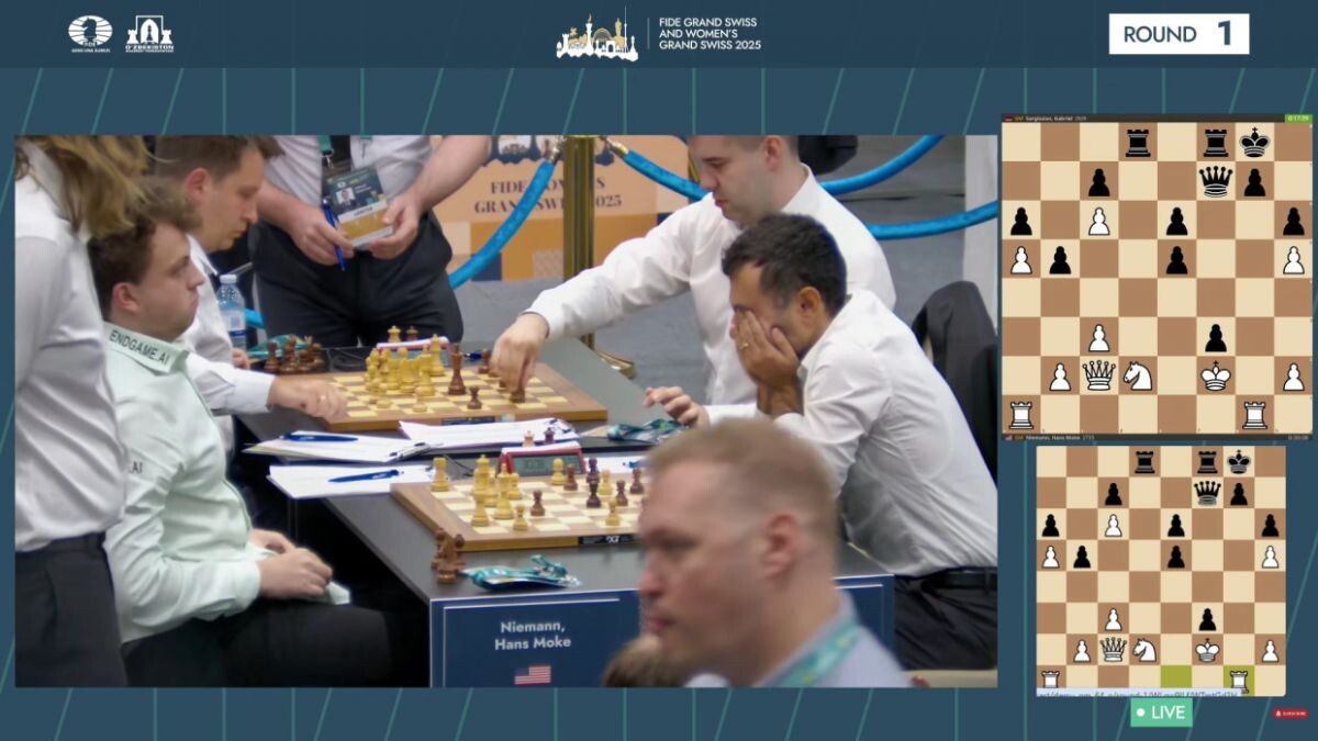 В Самарканде проходит международный турнир по шахматам «Большая швейцарка». Матчи проходят в Самарканде, с 4 по 15 сентября. Прошли три тура из одиннадцати. Брянский шахматист Ян Непомнящий занимает 29-ое место и на балл отстаёт от занимающего первое место Пархама Магсудлу из Ирана. В первой партии Непомнящий чёрными сыграл вничью с Андреем Волокитиным из Украины - она закончилась на 37-м ходе после трёх повторяющихся ходов (на фото на заднем плане). Партия завершилась скандалом - шахматисты не пожали друг другу руки, нарушив регламент проведения соревнований. Во второй партии белыми обыграл Эдиза Гюреля из Турции. В третьем туре Непомнящий чёрными сыграл вничью с Салехом Салемом (ОАЭ). Завтра пройдёт четвёртая партия, начало в 13.15 по московскому времени. Будет сыграно 11 туров по швейцарской системе. Контроль времени - 100 минут плюс 30 секунд, с добавлением еще 50 минут после 40-го хода и еще 15 минут после 60-го хода.