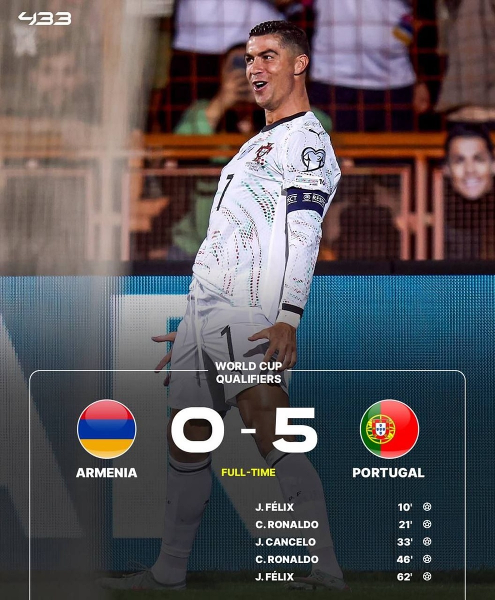 🇵🇹🇦🇲Португалия победила Армению 5:0! Роналду и Феликс сделали по дублю. Напомним, что оба нападающих играют в саудовском Аль-Наср. Сыгранный дуэт не помешает сборной перед ЧМ. Так же Роналду забил 140 голов в сборной и пробил отметку в 1200 результативных действий в своей карьере! ⚽️ 942 забитых мяча 🅰️ 258 голевых передач