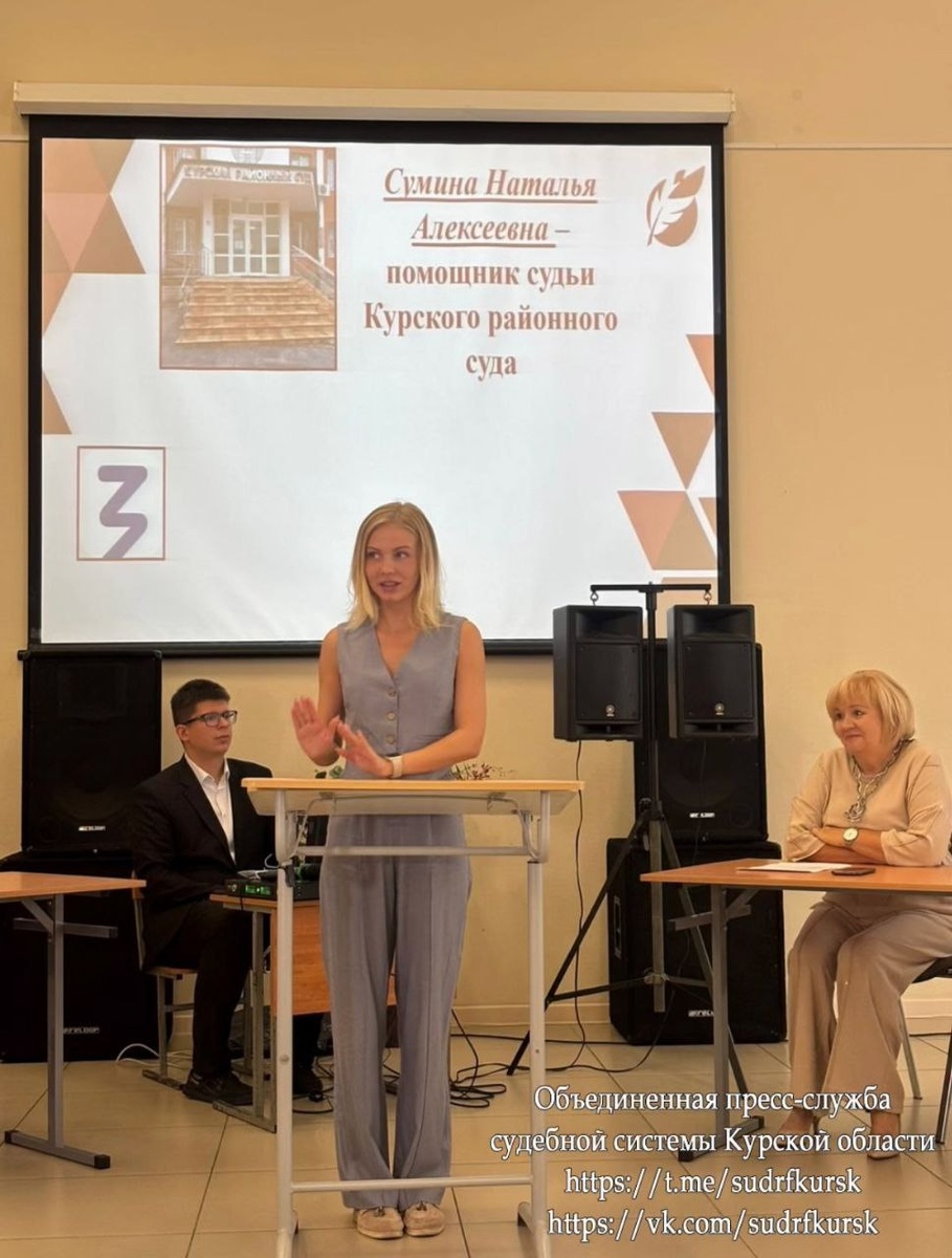 Помощник судьи Курского района стала куратором юргруппы для школьников В рамках грантового проекта помощник судьи Курского районного суда Наталия Сумина является куратором юридической группы для школьников. Она стала наставником для ребят из 44 гимназии. Наставничество проводится в рамках реализации масштабного профориентационного проекта, который стал победителем конкурса и получил государственную грантовую поддержку. Отмечается, что Наталия Сумина имеет многолетний опыт работы в суде и глубокие профессиональные знания. Она курирует группу из 10 учащихся 9 класса.