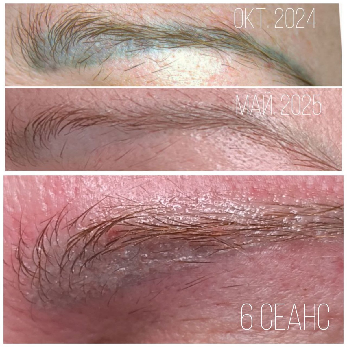 ✨ Удаление татуажа бровей — это всегда работа в тандеме с организмом. На фото — динамика с октября 2024 по сентябрь 2025 и уже 6-й сеанс. Работаем по системе: 🔹 неодимовый лазер 🔹 + Revivink 6thSense Неожиданно пигмент ушёл в более тёмный оттенок. Такое бывает, когда в дерме меняется химический состав красителя под воздействием лазера. Чтобы ускорить выход, мы положили оксид кальция максимально глубоко — это обеспечивает успешное выведение частиц. ⚡ Но что делать, если организм не спешит отдавать пигмент? Самое правильное решение — пауза минимум на 2 месяца. Почему так? Под действием Revivink в дерме происходит сложная работа: активные компоненты связывают фрагменты пигмента и формируют комплексы; кожа запускает воспалительно-репаративную реакцию, образуется корочка, под которой идёт выталкивание красителя; макрофаги и лимфа постепенно выносят разрушенные частицы; ткани должны восстановиться, чтобы не возникло застойного воспаления и рубцевания. 💡 Если спешить и работать «вдогонк