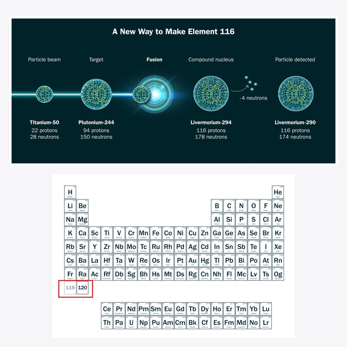 В Японии RIKEN пытается синтезировать элемент-119 из ванадия-51 + кюрия-248, а в Беркли (LBNL, США) готовят тяжёлую схему титан-50 + калифорний-249 для элемента-120. Эти эксперименты измеряются месяцами непрерывной работы и счётами на уровне один атом - за всю кампанию