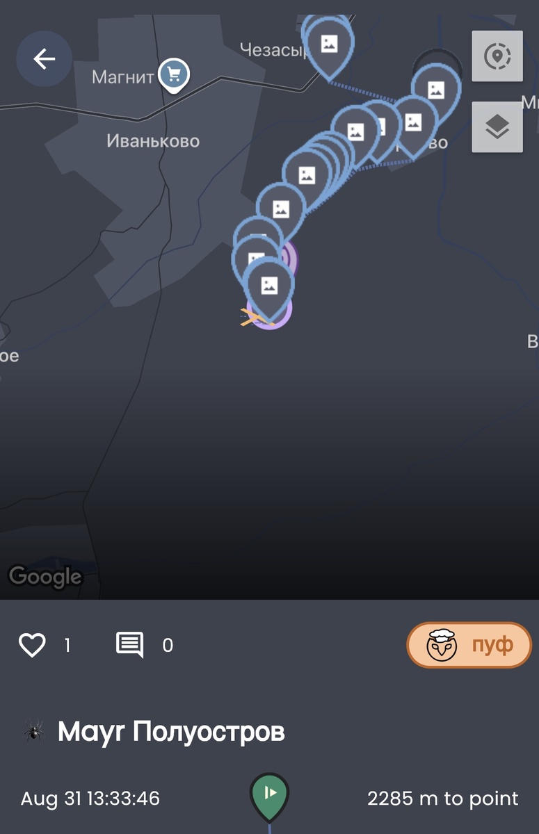 Доброго времени суток, на прошлой неделе мы ходили в мини-поход по приложению ранданавтика. Что это вообще такое? Я и сама не до конца понимаю концепцию этого приложения, но когда нечем заняться и хочется пойти «куда глаза глядят» - то, что нужно. Вообще, если вкратце объяснить, что я вычитала в интернетах, то рандонавтика - работает при помощи квантового генератора случайных чисел, но там еще каким-то образом замешана психология, какие-то точки пересечения, аномалии, вообщем максимально непонятные темы. Насмотревшись в соцсетях, что находят подростки на рандомных точках, было немного страшновато, т.к мы находились на даче за городом, а точка нам выпала в какой-то небольшой лесок. Ну что ж, делать нечего, пошли. Сразу скажу, что мы ничего не загадывали, просто хотели по пути пособирать грибов и вот точка выпала на лес.. Совпадение? Не думаю.. Маршрут наш выглядел примерно так. Мы не стали идти так, как показывает навигатор, а я пошла по привычным тропкам, чтобы охватить как можно боль