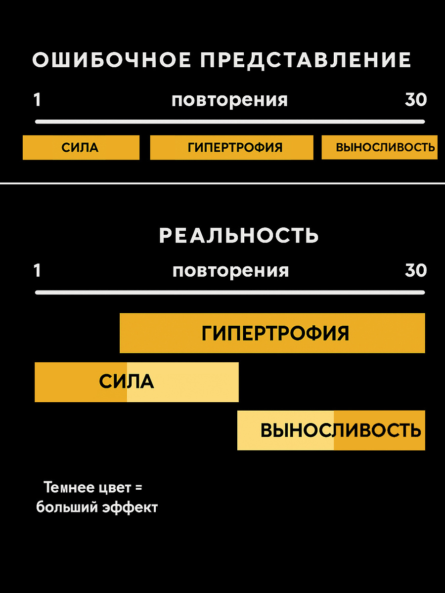 Сколько делать повторений ? Долгое время считалось, что: - малое количество повторений = сила; - среднее количество повторений = гипертрофия; -большое количество повторений = выносливость. 📃 Но многие исследования последних лет показывают: 👉 мышцы растут в широком диапазоне повторений — примерно от 5, на 15, и даже на 30. 👉 сила лучше всего растёт на низких повторах (с большими весами). 👉 выносливость — на высоких. Поэтому в вечных спорах "я накачался на многоповторке" и "я накачался при 10 повторениях" обе стороны по своему правы. Тут работают индивидуальные предпочтения и выбор упражнений. Представьте предотказные подходы на 30 повторений в приседах, такую тренировку выдержит далеко не каждый. Ключевые моменты: - Важно тренироваться близко к отказу, примерно 2-3 повторения до полного отказа; -Больший вес и меньшее количество повторений тренирует силу, но при этом всегда есть риск травмы, не каждое упражнение стоит выполнять в таком диапазоне и не на постоянной основе. -Для о