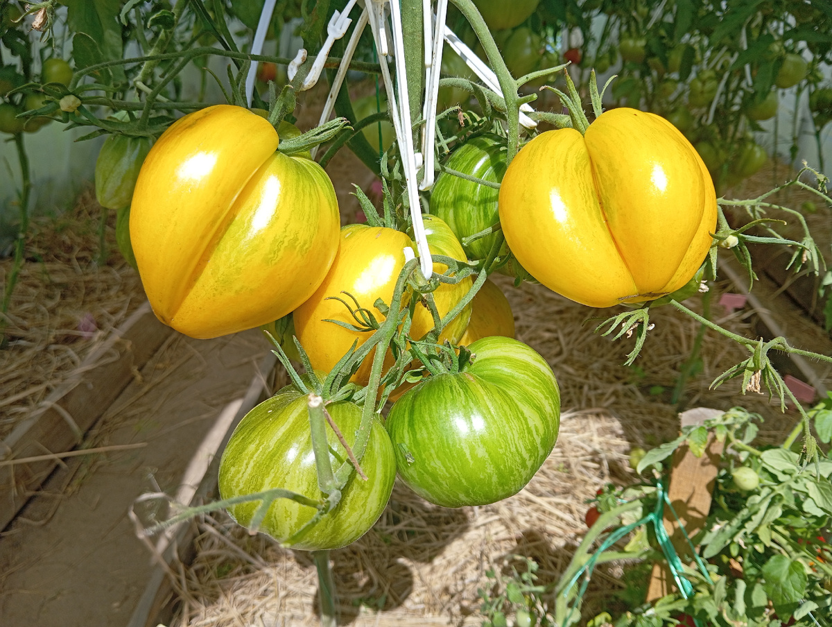 ЧАСТЬ 5: Биколоры, желтоплодные, белоплодные, зеленоплодные, темноплодные томаты Тайна желтого озера ОТКРЫТИЕ сезона! Высокорослый (1,8 м), среднеспелый, сверхурожайный сорт. Красивейшие желтые плоды, как бы просвечивают насквозь, весом 200-400 г. Вяжут без устали снизу до верха. Мякоть сладкая, сочная. СУПЕР! ЛИСТАЙТЕ ВПРАВО Манго-джанго Высокорослый (1,8 м), среднеспелый сорт. Плоды – точная копия манго сорта Синдри – вытянуто-овальные с небольшим носиком, блестящие, массой до 250 г, в биологической спелости желто-оранжевые. Мякоть оранжевого цвета, очень нежная, сладкая. СУПЕР! ЛИСТАЙТЕ ВПРАВО Король ананас Высокорослый, среднеспелый сорт. Огромные урожаи красивейших, ярких, сладких плодов-биколоров, массой до 1 кг. Плодоношение до морозов, отличная устойчивость к заболеваниям. Вяжет без пропусков. СУПЕР! ЛИСТАЙТЕ ВПРАВО Желтые гребешки ПОВТОР прошлых лет. Среднеранний, высокорослый (2 м). Очень урожайный сорт, кусты облеплены плодами красивого желто-оранжевого цвета. Требует под