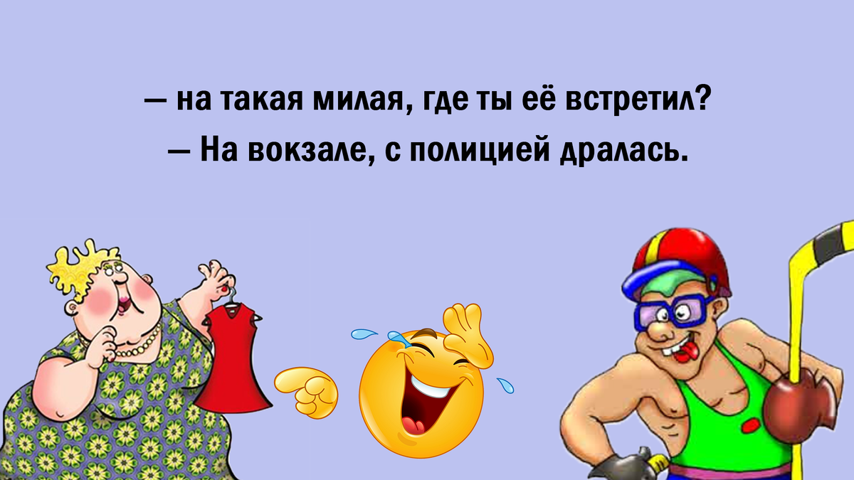 1. Время Вовочки На уроке русского языка учительница задаёт Вовочке вопрос: — Вовочка, фраза: «Я ищу жениха». Это какое время? — Потерянное, Марья Ивановна. ⸻ 2. Цветочный ларёк Молодой парень подходит к цветочному ларьку. — Мне бы букет цветов… — Пожалуйста, у нас огромный выбор. Вам какие? — Ой, я даже и не знаю… — Позвольте я вам помогу. Из-за чего вы поссорились? ⸻ 3. Развозчик пиццы Муж роется в мобильном телефоне жены и вдруг натыкается на незнакомый номер, который позвонил в 23:00. Он звонит по номеру. — Ты кто? — спрашивает муж. — А ты сам-то кто?! — Я муж Люси… — А я развозчик пиццы. Как вы меня все достали!.. ⸻ 4. Первый сентября 1939 Первого сентября тысяча девятьсот тридцать девятого года Гитлер напал на Польшу. А что сделаешь ты, чтобы не пойти в школу? ⸻ 5. Пятница тринадцатого Плохая новость: в 2013 году каждая пятница будет пятница тринадцатого. ⸻ 6. Татуировка для патологоанатома Сделай себе татуировку на груди «Перед вскрытием — взболтать!» — повесели патологоанатома.