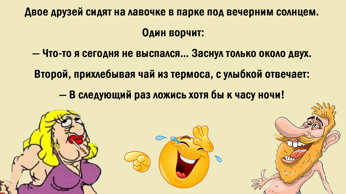 1. Продукты — Что такое продукты горения? — Это то, что получается в результате горения. — Тогда что же такое продукты питания? ⸻ 2. Телевизор и бокал Муж купил новый телевизор. Жена: — Ой, а почему на коробке бокал нарисован? Муж: — Это значит, что покупку надо обмыть. ⸻ 3. Таблетки для похудения В аптеке: — Девушка, дайте, пожалуйста, таблетки для похудения. Аптекарь: — Женщина, я час назад продала вам десять пачек! — Я не наелась. ⸻ 4. Посадка самолёта Незадолго до посадки: Стюардесса выбегает в салон: — Есть ли на борту пилоты? Салон замирает. — Космонавты, летчики? Пассажиры немеют. — Ну хотя бы прокуроры? Гробовое молчание. Из хвоста самолёта раздается дрожащий голос: — У меня есть небольшой опыт сажать картошку. ⸻ 5. Мастер по плите — Вы мастера вызывали? — Да, у нас плита на кухне сломалась. — А вы уверены, что того мастера вызвали? — Конечно, ведь вы плиточник. ⸻ 6. Больное горло — Доктор, у моей жены болит горло и пропал голос. Что делать? — Придите домой в три часа ночи. — А