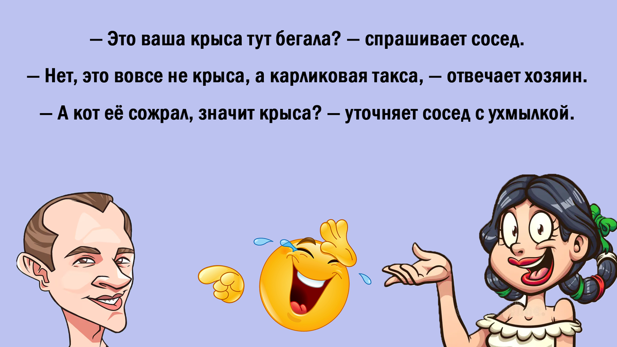 1. Роды и ангел Девушка должна родить. Во сне к ней является ангел и говорит: — Я сделаю так, чтобы во время родов половину боли чувствовал отец ребенка. Она родила и спрашивает мужа: — Как спал? — Плохо. Сосед всю ночь орал, как будто рожает. ⸻ 2. Иван-царевич Иван-царевич читает надпись на камне: — Прямо пойдешь — коня потеряешь. — Направо пойдешь — меч потеряешь. — Налево пойдешь — дома прибью. — Твоя Василиса. ⸻ 3. Железнодорожный вокзал Бабка-уборщица орет: — Хто нахаркив, хто нахаркив? Мужик: — Ну я, на Харкив! — От и убирайся сам! ⸻ 4. Страх перед браком Спрашивают женщину: — Не страшно выходить замуж? — Первый раз да, а потом хоть каждый день выходи. Спрашивают мужчину: — Не страшно жениться? — Первый раз нет, а потом, ох, как страшно. ⸻ 5. Подарок из аптеки В аптеке: — У вас есть средство от блох? — Да, платите в кассу. — А вы заверните его покрасивее, мне на подарок. ⸻ 6. Проблемы с потенцией — Доктор, у меня не стоит. — Пейте керосин! — А что поможет? — Милейший, он самолёты