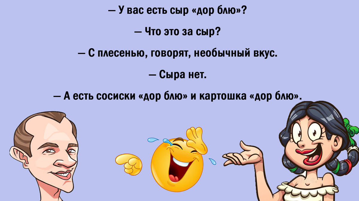 1. Новый Славик — Что за новый Славик у тебя в телефоне? — Я туда позвонила, а там женский голос! — И как это понимать? — А очень просто! Там такая же дура схватила телефон, чтобы послушать, что за новый Сергей у Славика в телефоне. ⸻ 2. Магазин и яйца Жена говорит мужу: — Сходи в магазин и купи яиц. Муж: — У меня есть два яйца. Тебе хватит? Жена: — А что их можно съесть? Он: — Съесть нельзя, а полизать можно! Она: — Ну и замечательно! Утром тогда полижешь их себе на завтрак. ⸻ 3. Конституционная монархия в голове — Ты что, совсем без царя в голове? — Не правда. У меня там конституционная монархия. — Это как? — Царь вроде бы есть, но реальная власть у тараканов. ⸻ 4. Лиса и волк Бежит лиса по лесу. Вдруг из кустов: — Ку-ка-ре-ку. Лиса в кусты. Возня, визг. Выходит волк, застегивая ширинку. — Вот, что значит знание иностранных языков. ⸻ 5. Злая ведьма — Что-то друга твоего давно не видно. Вы же были с ним не разлей вода. — Злая ведьма заколдовала его и держит в заточении. — Женился? — Д
