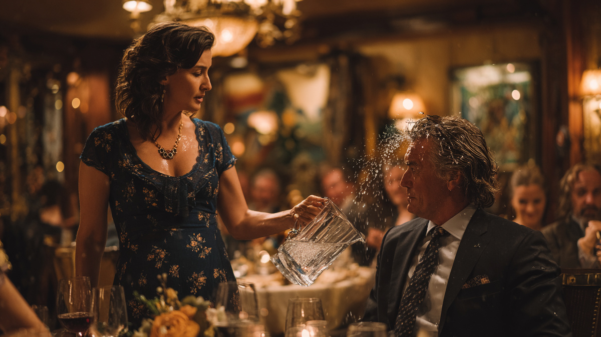 Марина медленно поднялась со своего места, взяла графин с водой, стоявший на столе, и не говоря ни слова, вылила его содержимое Виктору на голову.