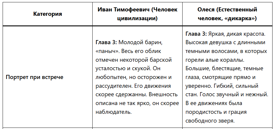Вывод по пункту: Куприн рисует классический конфликт «природа и цивилизация». Олеся воплощает естественное, чистое, искреннее начало. Иван — начало социальное, разумное, но надломленное условностями и внутренней слабостью.
