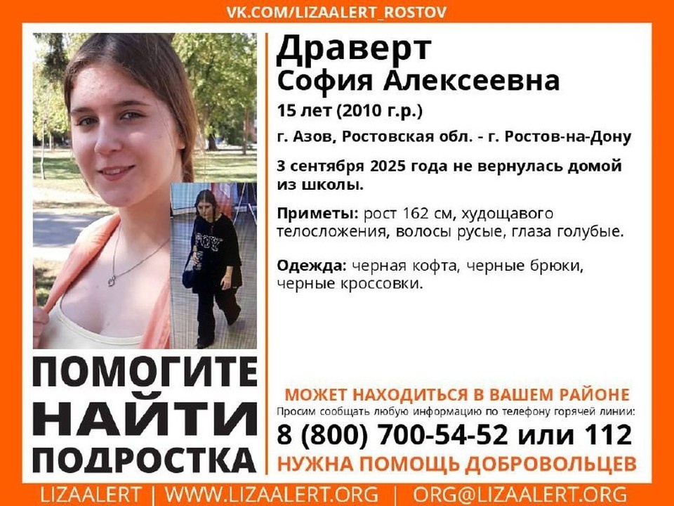 Юная жительница Азова София Драверт ушла в школу 3 сентября и пропала. Школьница училась во вторую смену, поэтому в тот день родители решили заехать за ней после занятий. Но девочки в школе не оказалось. Более того, учителя сказали, что она пропустила последний урок. Домой София тоже не вернулась и перестала отвечать на звонки. На поиски подростка сразу же были подняты волонтеры и полиция. Но пока их усилия ничего не дали. В кустах возле школы они нашли только мокрый рюкзак девочки. По словам матери, София не первый раз пропадает. В апреле этого года ее уже разыскивали всем миром. Тогда девочки не было дома три дня. Слава богу, ее нашли живой. С компанией таких же подростков она отправилась в Ростов, чтобы погулять в парке. На этот раз София отсутствует уже четвертые сутки. - Дочь у меня очень легко знакомится с людьми, - пояснила женщина - К счастью, тогда ее никто пальцем не тронул. Мать надеется, что и в этот раз с девочкой будет все хорошо, но все же очень боится. -Софа еще ребено