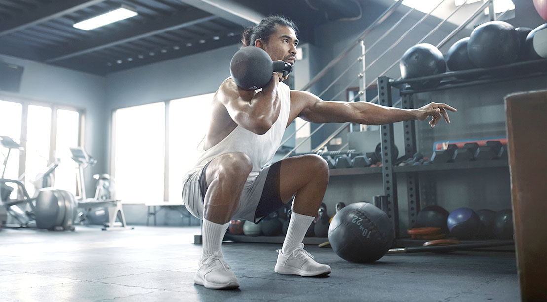 - A1. Приседание с гирей у груди (Goblet Squat): 3х8-12 повт. Темп: 4-2-1-1. Отдых 60 сек.