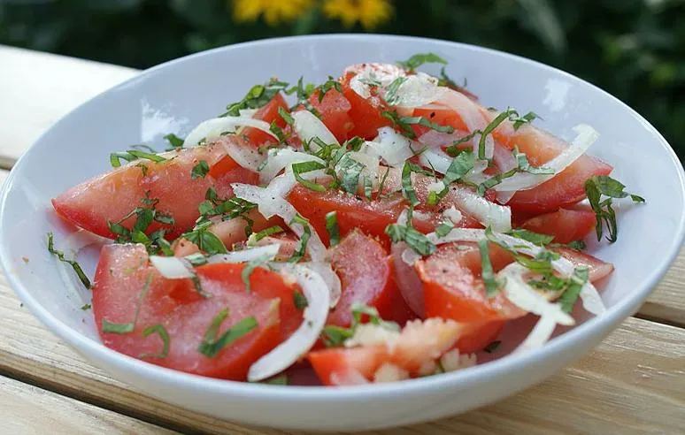 Вкусный и простой салат из помидоров, лука и зелени! Этот рецепт — настоящая находка для тех, кто ценит простые и вкусные блюда. Вам понадобятся самые обычные продукты: Как приготовить: Салат готов! Можно есть сразу, но лучше поставить в холодильник и дать ему немного остыть — так будет ещё вкуснее. Приятного аппетита!