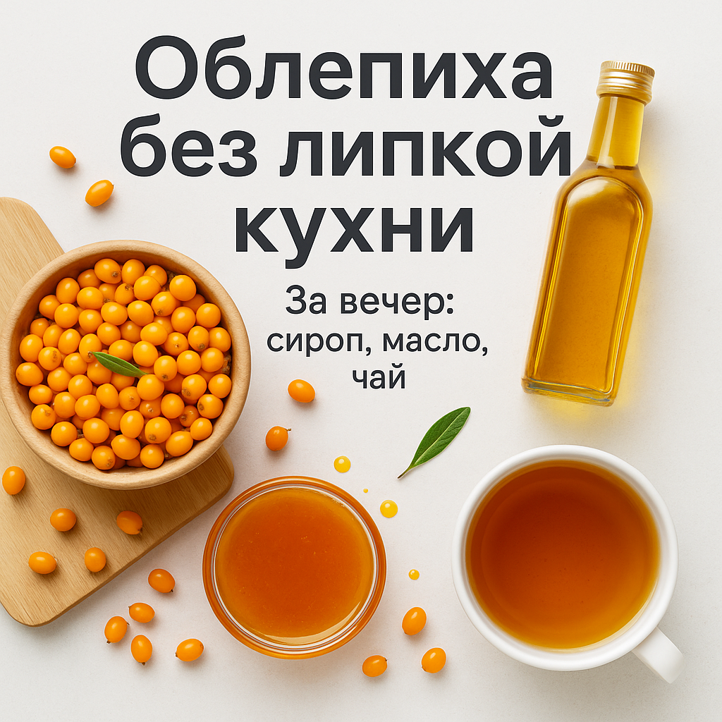 Короткая и практичная статья без «воды»: что сделать с ягодами сегодня, чтобы завтра у вас были напиток, ароматная заправка и тёплая чайная смесь. Всё — аккуратно и без оранжевого хаоса на кухне. — Подготовка и чистая переработка — Формулы «одним взглядом» • Сироп: на 1 л сока — 700–900 г сахара; нагрев 85–90 °C, без кипячения. • Лимонад: 250 мл воды + 1–2 ст. л. сиропа (или 1 замороженный кубик). • Масло-мацерат (кулинарное): подсушенный жмых : рафинированное масло = 1 : 2 по весу; 14 дней настаивания, встряхивать ежедневно; хранить в холодильнике. • Чай: сушёные косточки/шкурки — 1 ч. л. на 250 мл, вода 80–90 °C, 7–10 минут под крышкой. — Польза для рациона (коротко и без чудо-обещаний) • Витамин C и кислота ягоды освежают вкус напитков и соусов; сироп без кипячения сохраняет часть «цитрусовой» свежести. • Каротиноиды окрашивают масло и добавляют мягкую «солнечную» ноту в салаты. • В жмыхе и косточках есть жирные кислоты; мацерат — простой способ добавить их в еду. • Витам