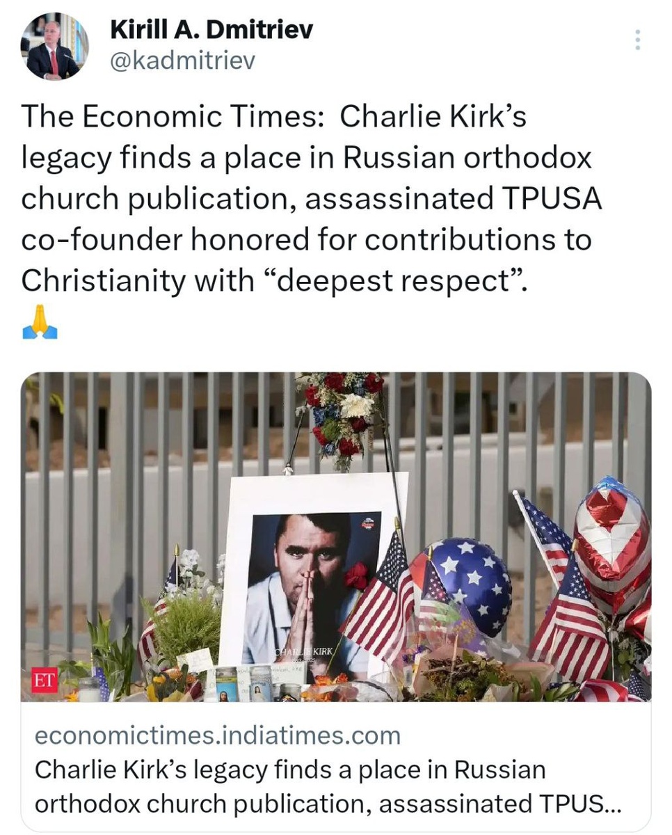 В ответ на пост 'Profound RESPECT' for Charlie in TOP Russian Orthodox Church publication Putin’s envoy Dmitriev says Kirk’s LEGACY has found a place In article: The Example of Charlie Kirk is a Lesson For Us