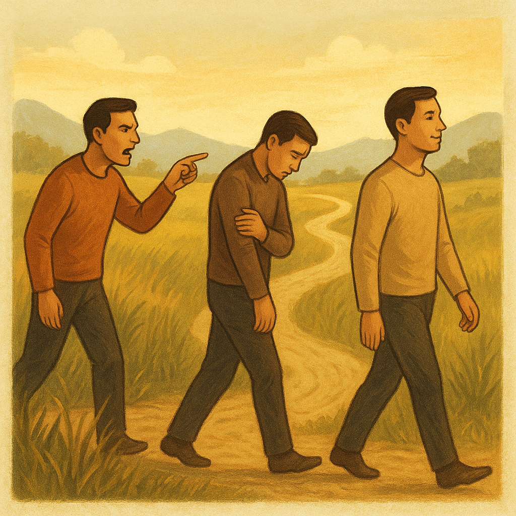Когда в нашей жизни что-то идёт не так, первое естественное движение ума — искать виноватого. Мы указываем пальцем на обстоятельства, на людей рядом, на государство, на родителей. Но за этим простым жестом скрывается тяжёлый груз — обида, злость и чувство бессилия. Представь путешественника, который идёт по дороге. Пока он винит других — его путь кажется бесконечным. Каждая яма на дороге — чья-то вина, каждый камень — повод для жалобы. Он тратит силы на крики и споры, но не продвигается дальше. Когда человек начинает винить себя — дорога становится короче. Это уже шаг вперёд: он начинает замечать, что многое зависит от его решений, привычек и выборов. Но есть и другая сторона — это самокритика, она может превратиться в тяжёлый камень в рюкзаке. Тогда каждый шаг будет даваться с болью: "Я виноват, я плох, я должен был иначе…" И вот третий этап — когда путешественник вдруг понимает, что дорога, это всего-навсего дорога. Она полна ям и поворотов, но в этом нет ни виноватых, ни невиновн