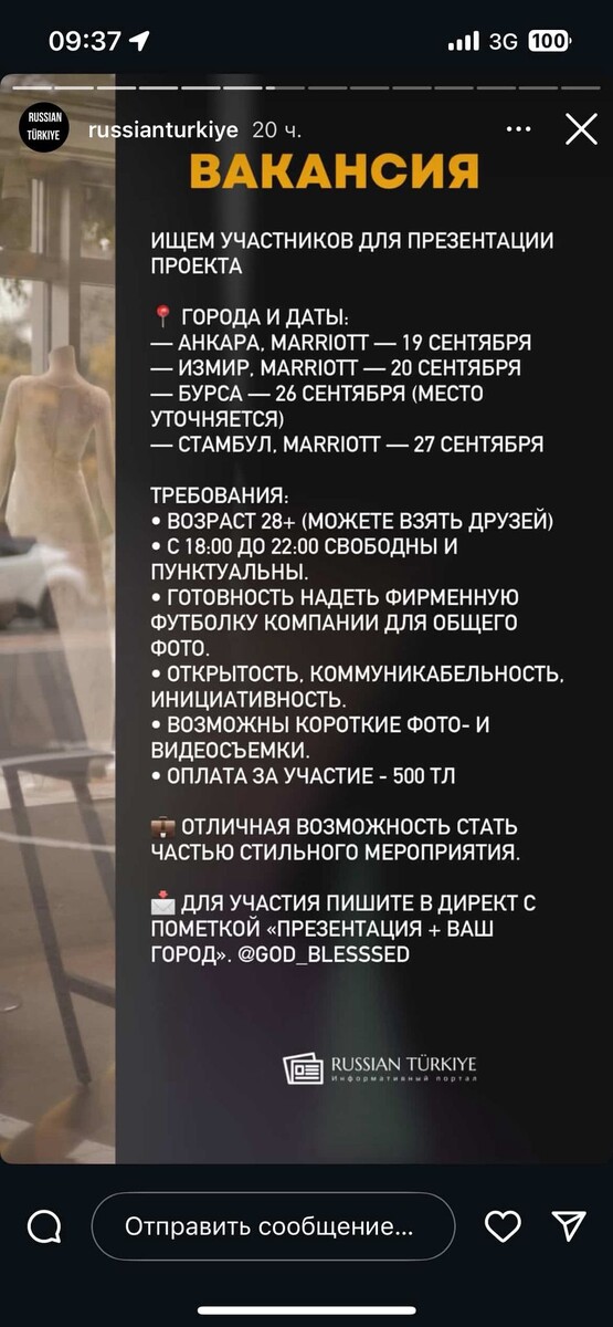 Мне написала знакомая из татарской группы и предложила подработку — помощь в организации презентации проекта. Событие должно было пройти уже сегодня вечером в отеле Marriott, оплата — то ли 500 рублей (так было указано в афише), то ли 1000 лир (так написали в сообщении). Я подумала: пусть даже 500 лир — тоже неплохо.