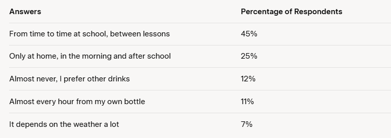 Задание 38.1 (Эссе для ЕГЭ по английскому языку) Imagine that you are doing a project on how often Zetland teenagers drink water. You have found some data on the subject – the results of a survey (see the table below). Comment on the survey data and give your opinion on the subject of the project. The survey question: How often do you drink water? Write 200–250 words. Use the following plan: · make an opening statement on the subject of the project; · select and report 2–3 facts; · make 1–2 comparisons where relevant and give your comments; · outline a problem that can arise with maintaining regular water intake and suggest a way of solving it; · conclude by giving and explaining your opinion on the importance of drinking water regularly. Данные указывают на проблему: подростки в Зеландии не очень дисциплинированы в потреблении воды, что может привести к обезвоживанию, особенно в школьной среде. Вода — основа здоровья, помогает с концентрацией и энергией, но здесь видно влияние привы