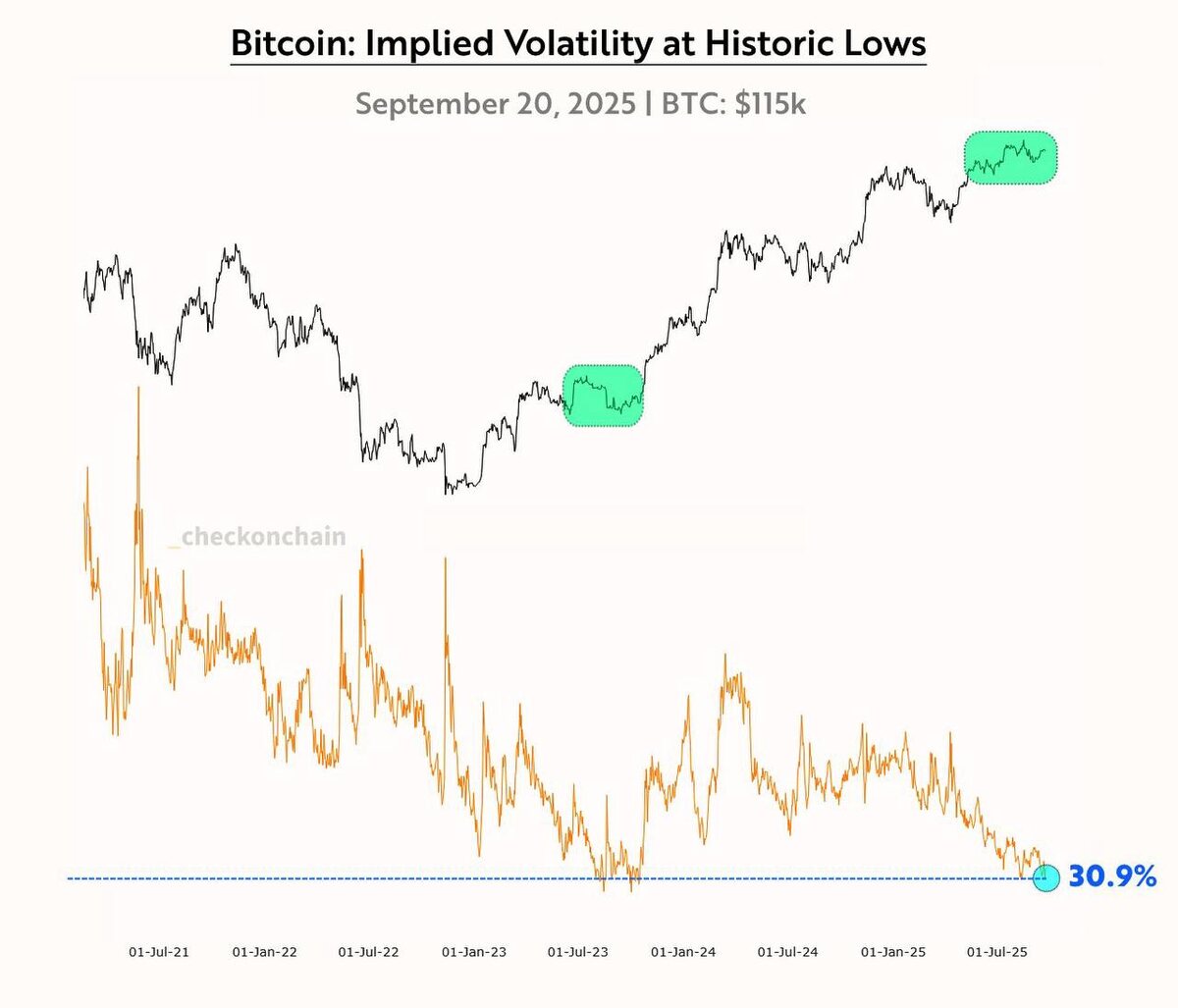 Биткойн: штиль перед бурей или новая норма? Одномесячная подразумеваемая волатильность по $BTC опустилась к историческим минимумам — всего 30,9%. Для сравнения: аналогичный уровень мы видели в 2023-м во время так называемого «Stablecoin Summer», когда биткойн неделями стоял в узком коридоре $26k–$29k и сводил инвесторов с ума своей апатией. Что это значит сейчас? — Сильное сжатие пружины. Исторически периоды низкой волатильности сменялись мощными движениями. Вопрос только в какую сторону. — Психологическая мясорубка. Когда рынок «стоит на месте», толпа устает, руки слабеют — и именно тогда начинается движение, которое ломает ожидания. — $115k как новый коридор. Цена замерла в боковике на высоких уровнях. Это не повод расслабляться: боковики редко длятся вечно. Моя мысль: низкая волатильность — не сигнал к скуке, а предупреждение. В такие моменты выигрывают те, кто держит план, а не эмоции. Ранее мы обсуждали ончейн-метрики, которые показывают структуру сети. Волатильность добав