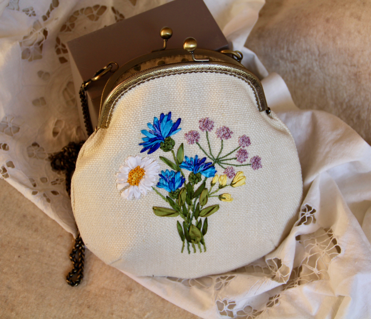 И косметичка из льна натурального цвета с ромашками