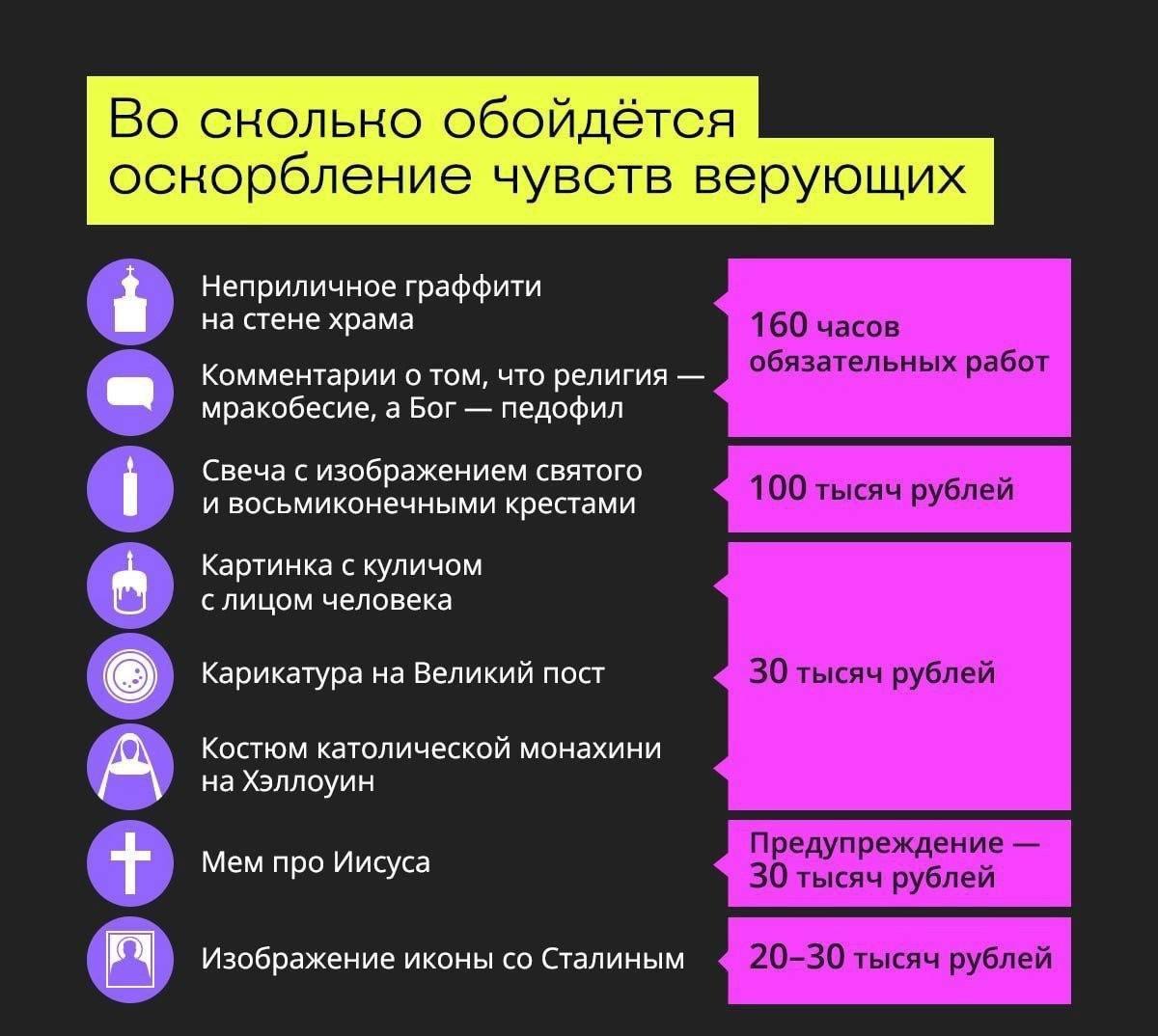 😭Россиян массово штрафуют за мемы про Иисуса и Сталина Суды всё чаще рассматривают дела за неуважение к религии. Например, за карикатуры на Великий пост, иконы с Иосифом Виссарионовичем и куличи с лицами людей наказывают на 30 тысяч. Например, москвич, создавший паблик с мемами про Иисуса, после двух штрафов и угроз сменил тематику сообщества и теперь публикует только изображения с котами. 👉 Подписаться на канал