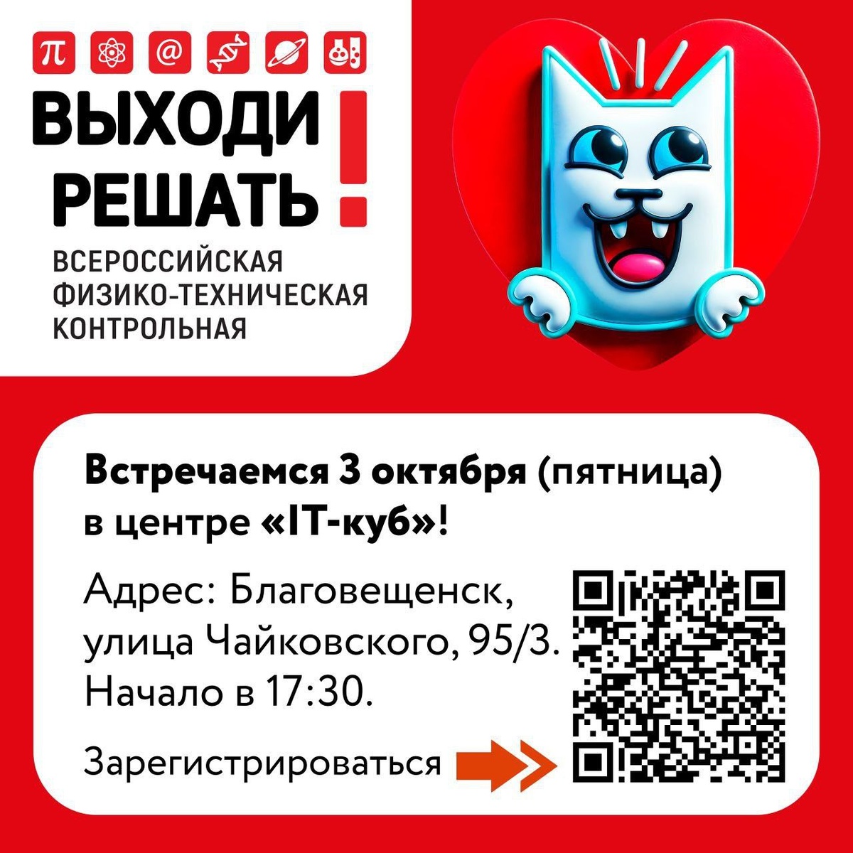 Благовещенских школьников приглашают на всероссийскую физико-техническую контрольную «Выходи решать!» Решать задачки будут 3 октября в центре «IT-куб» на Чайковского, 95/3. Здесь участники не только ответят на вопросы контрольной, но и пройдут квест «Ночь науки», а самые-самые получат подарки и поощрительные призы. Возраст школьников - 14+ Начало мероприятия в 17:30. Регистрация обязательна: https://clck.ru/3P2Csw #АОТВ