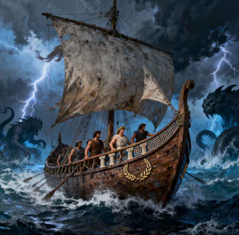 После взятия Трои Одиссей, царь Итаки, десять лет скитается по морям, пытаясь вернуться домой. На пути ему встречается множество препятствий: остров лотофагов, где плод лотоса лишает памяти; остров циклопа Полифема, где Одиссей проявляет хитрость и спасается с товарищами; странствия у царя ветров Эола, затем у колдуньи Цирцеи, превращающей людей в свиней. Он сходит в подземное царство мёртвых (Аид), слушает роковой призыв сирен, проходит между чудовищами Сциллой и Харибдой, теряет всех спутников из-за гнева бога Посейдона и гибели на острове Гелиоса. Героя спасает богиня Афина: после долгого плена у нимфы Калипсо и испытаний на острове феаков Одиссей возвращается домой, где жена Пенелопа долгие годы хранит ему верность, отбиваясь от женихов. Под видом странника Одиссей с помощью сына Телемаха и своей верной служанки Евриклеи разоблачает и убивает женихов, вновь обретает трон и мир в Итаке. Жанр: эпическая поэма, древнегреческий героико-приключенческий эпос. Основная тема — путь героя к