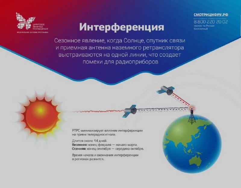 Возможны кратковременные сбои в телеэфире С 1 по 23 октября жители Красноярского края могут столкнуться с кратковременным ухудшением сигнала цифрового ТВ из-за солнечной интерференции. Не стоит волноваться: явление продлится всего несколько минут и затронет не всех! 📡 Что происходит? Солнце, двигаясь по небу, временно оказывается на одной линии со спутником связи и наземной станцией. Его радиоволны могут слегка «глушить» телесигнал. 📺 Будет ли картинка пропадать? В эпоху цифрового эфирного ТВ влияние интерференции минимально, но возможны: 🔹 кратковременное «зависание» изображения 🔹 распад картинки на пиксели 🔹 слабые помехи 🕙 Когда ждать сбоев? С 12:13 до 13:20 — именно в этот период Солнце максимально влияет на сигнал. 🔍 Как проверить график? ➡ На сайте (https://ртрс.рф) в разделе «Временные отключения» ➡ В мобильном приложении «Телегид» ➡ В «Кабинете телезрителя» 📞 Если у вас возникли вопросы, звоните на горячую линию РТРС: 8-800-220-20-02 (бесплатно по России).