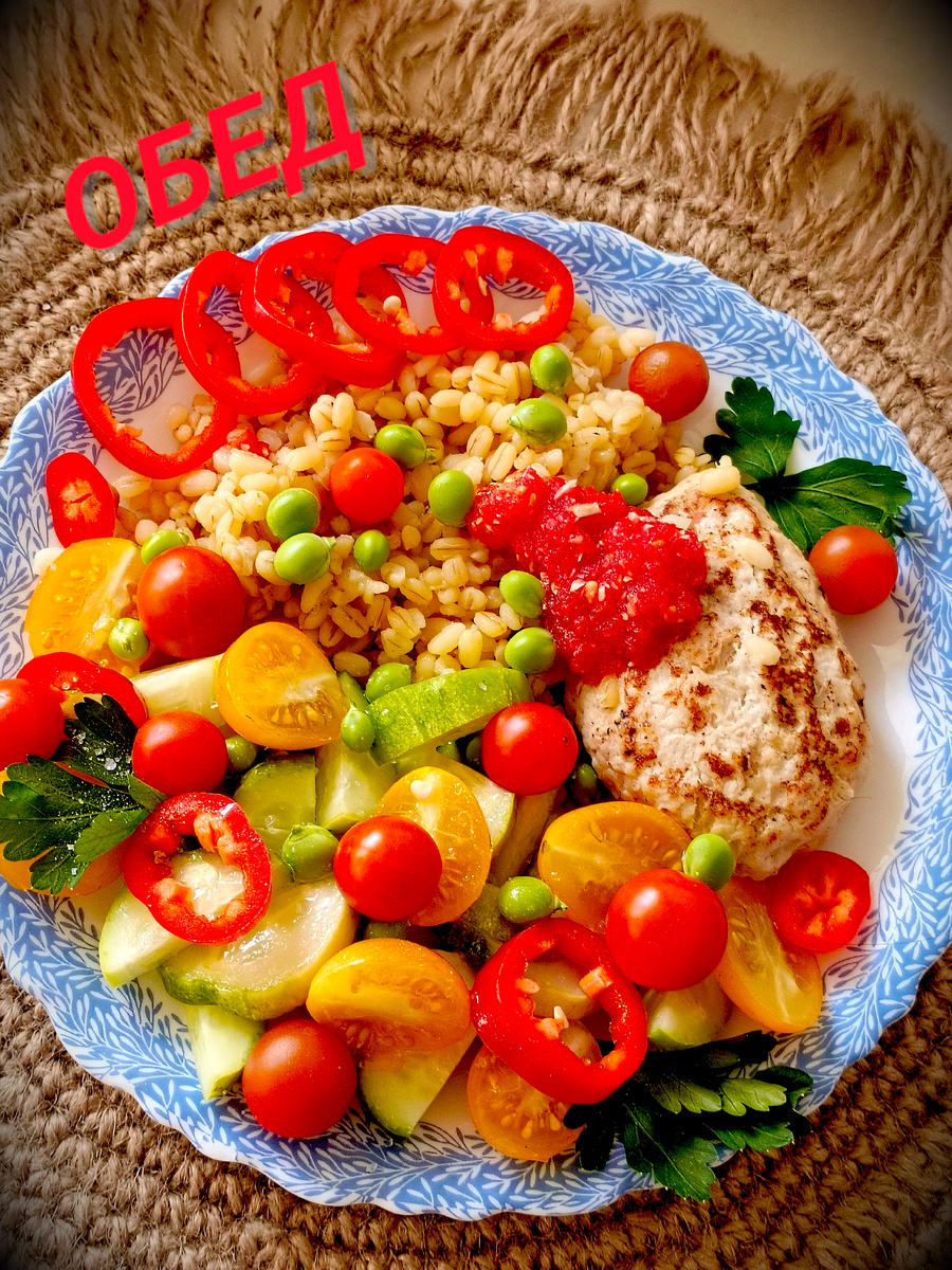 Обед - это не просто перерыв, это такой же важный и полезный прием пищи как и завтрак. Соблюдая правило тарелки, очень важно не допускать голода. Когда мы сыты, наш организм не чувствует опасности и не склонен накапливать лишний жир. Обед состоящий из котлет из куриной грудки, творога и кабачка, в сочетании с булгуром и свежими овощами, не только вкусный, но и очень полезен. Котлеты - отличный источник белка. Добавление творога делает их более нежными и увеличивает содержание кальция, что полезно для костей. Кабачок в свою очередь добавляет лёгкость и клетчатку, способствующую хорошему перевариванию. Булгур богат сложными углеводами, которые обеспечивают длительное чувство сытости и энергию на протяжении всего дня. Он также содержит витамины и минералы , такие как магний и железо, которые важны для обмена веществ и поддержания иммунной системы. Свежие овощи, такие как огурцы, помидоры и перец не только придают яркие цвета и свежесть блюду, но и являются источником витаминов, антио