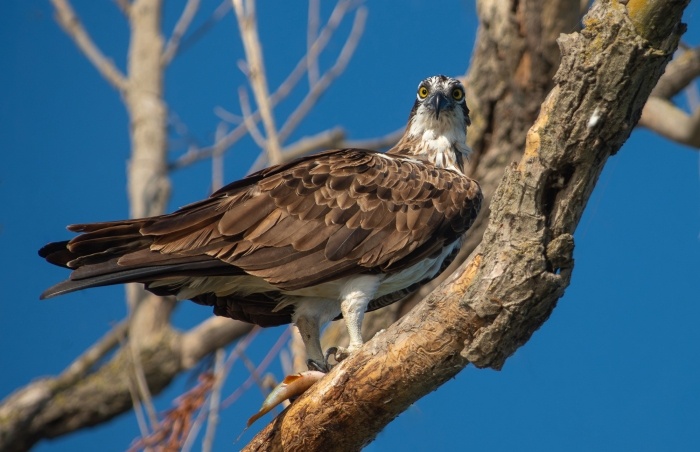 Интересно, что местные скопы, по моим наблюдениям, не очень боятся людей. Птенцы часто вырастают в гнездах рядом с протоками, по которым то и дело проезжают туристы или рыбаки, так что звука моторной лодки они особо не пугаются. К некоторым птицам, обычно это были двух-трехлетние скопы, которые еще не обзавелись парой, удавалось подойти на лодке близко. Если хищник в это время был увлечен едой, его можно было спокойно сфотографировать.