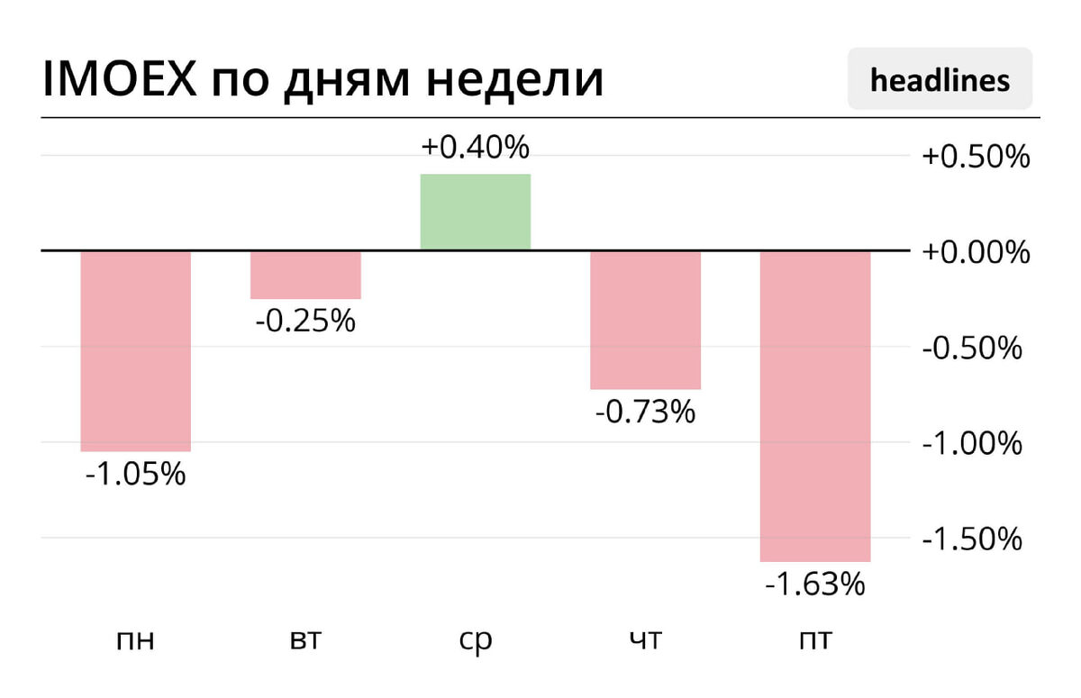 Индекс МосБиржи по дням недели и Топ-10 акций по объему