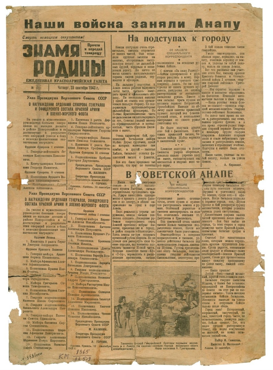 ❗️21 сентября — День освобождения Анапы от немецко-фашистских захватчиков! 📜Статья из газеты «Знамя Родины» от 23 сентября 1943 года «Наши войска заняли Анапу». фото Анапский археологический музей Подписывайтесь на Новости Анапы