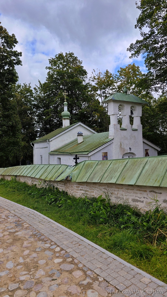 И тут взгляд цепляется за невысокую каменную ограду и аккуратную главку к югу от крепостных стен. Это не парадный собор, в который ведут все тропы, а скромная церковь Сергия Радонежского и Никандра Псковского.