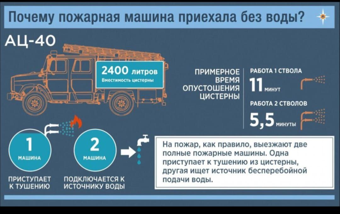 Накануне, поздно вечером, произошел большой пожар в селе Верхний Байлар Тукаевского района. Огонь уничтожил две бани, расположенные у частных домов. На место происшествия оперативно прибыли две пожарные машины из Набережных Челнов. Но, судя по присланным в «Челнинские известия» видео, местные жители были возмущены тем, что в цистернах быстро завершился запас воды, им пришлось самим носить воду в ведрах. Прокомментировать ситуацию мы попросили руководителя пресс-службы МЧС России по РТ Андрея Родыгина. «Запас воды в пожарной автоцистерне рассчитан на 5-7 минут работы под давлением при тушении пожара, – сообщил он. – Это связано с тем, что ёмкость стандартной машины порядка 2500-3000 литров воды, и этого объема хватает, чтобы проложить линии и обеспечить подачу воды. Время на пожаре идёт по-другому, и вода уходит махом. В таких случаях используют тактику подвоза: пока один автомобиль тушит, другой уезжает к ближайшему источнику и возвращается». Причина ночного возгорания в настоящее врем