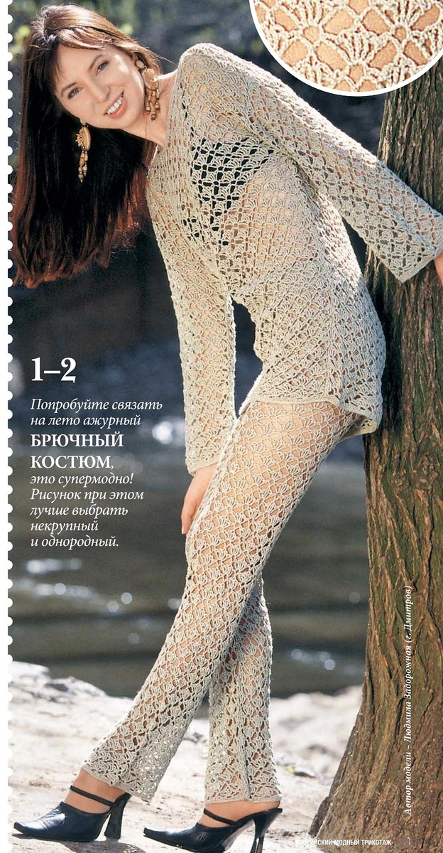 Размер: 44/46 Вам потребуется 800 г фисташковой пряжи (57% вискоза, 43% хлопок, 100 г/430 м); крючок № 2; круговые спицы № 2; тесьма- резинка шириной 4 см длиной 70 см. Переплетения Узор по схеме, ст. без накида, лицевая гладь. Плотность вязания 2 рапп, и 12 р. = 10 х 10 см, связано узором по схеме. ВНИМАНИЕ! Учтите, что полотно, связанное подобным узором, после от- паривания вытягивается в длину на 12-15 см. ТУНИКА СПИНКА Свяжите цепочку из 187 возд. п. + 1 возд. п. подъёма и вяжите узором по схеме. Провязав 94 ряда от начала работы, закончите работу. ПЕРЕД Вяжите, как спинку, Провя- зав 86 рядов от начала, для выреза горловины оставьте непровязанным 1 средний раппорт и вяжите обе половинки раздельно, оставляя непро- вязанными для закругления выреза горловины в каждом 2-м ряду 3 раза по 1/2 раппорта. Провязав 8 рядов от начала выреза горловины, закончите работу. ЛЕВЫЙ РУКАВ Свяжите цепочку из 136 возд. п. + 1 возд. п. подьёма и вяжите узором по схеме. Провязав 54 ряда от начала, закон