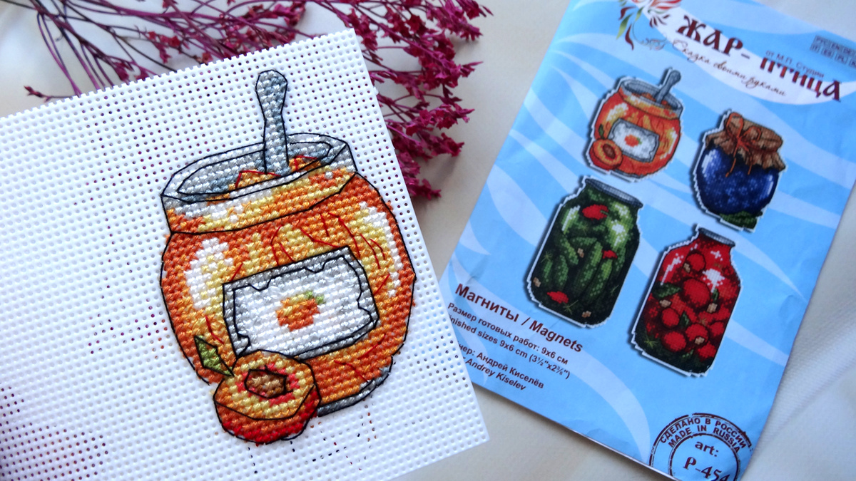 На этой неделе мой третий старт - это снова вышивка магниты. Взяла набор от "Жар-птицы". Это был подарок! И решила вышить пока две баночки с абрикосовым и сливовым вареньем. Такая красота получается🤗 Одна баночка готова!