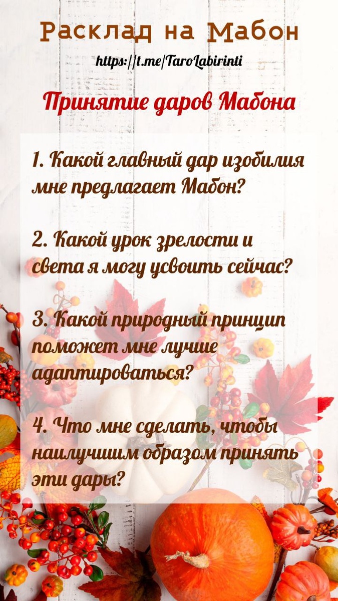🍁Расклад: “Принятие Даров Мабона”🍁 Дары Мабона: Принимаем Щедрые Послания Осени 🎃 Мабон, второй сбор урожая, – это время изобилия, благодарности и принятия. Природа делится своими щедрыми дарами, напоминая нам о цикличности жизни и важности как отдавать, так и принимать. 🎃 Этот расклад поможет вам раскрыть, какие именно дары Мабон предлагает вам сейчас, какой урок зрелости вы можете усвоить, какой природный принцип поможет в адаптации, и как наилучшим образом принять эти ценные послания осени. ❓Что именно мы анализируем этим раскладом: 🎃 Расклад сосредоточен на позитивных аспектах Мабона – получении плодов своих трудов, принятии изобилия, усвоении мудрости, которая приходит с опытом и зрелостью. Он направлен на то, чтобы помочь человеку осознать и принять дары, которые жизнь и Вселенная предлагают ему в этот период, и научиться жить в гармонии с природными циклами. 🃏 Вопросы и подробная расшифровка: 🍁 Какой главный дар изобилия мне предлагает Мабон? 🔸Что анализируем: Эт