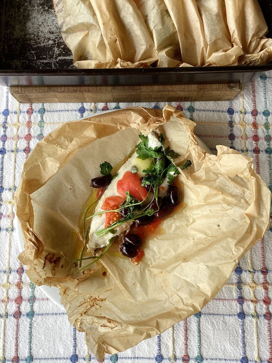 Это сочное блюдо, приготовленное на пару, отличается насыщенным вкусом и прекрасно сочетается с картофелем в сливочном масле, рисом или кускусом. Al cartoccio — это итальянская форма en pap illote , что означает «заключенный» или «в бумаге». Это эффективный метод приготовления, который удерживает влагу (и аромат), выделяемую ингредиентами, и создает паровую камеру для томления — это немного похоже на турецкую баню для еды! После того, как блюдо вынимают из духовки, но оно все еще запечатано, ароматный пар, удерживаемый в бумаге, снова становится жидким и создает бульонный соус. Рыба с плотной белой или розовой мякотью, которая распадается на жирные хлопья, особенно хорошо подходит для приготовления al cartoccio, как целая рыба (очищенная и с костями), так и отдельные филе (примерно 110–140 г на человека). Выбирая рыбу, помните, что мы, как правило, предпочитаем треску и пикшу, входящие в так называемую «большую пятёрку», на которую приходится целых 80% потребления в Великобритании. В