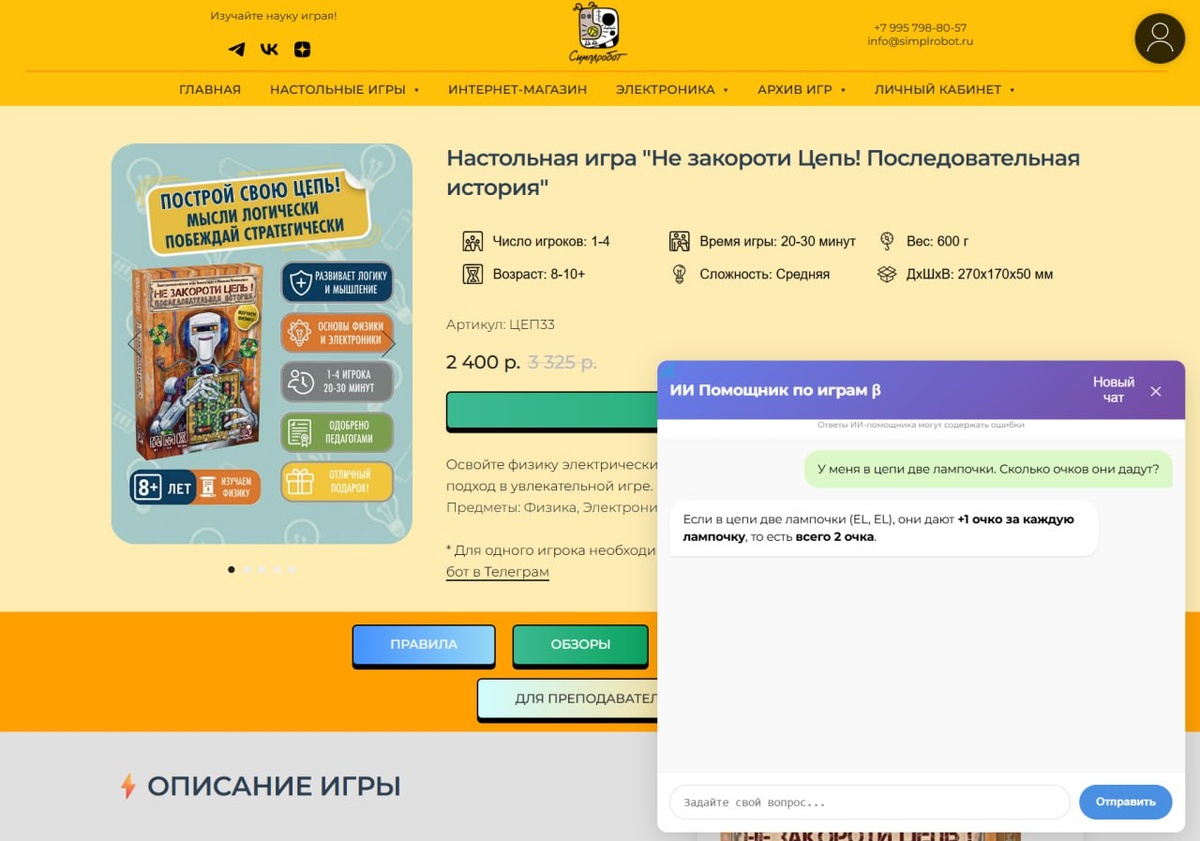 На страницах игр теперь доступен в бета-версии ИИ помощник, который поможет вам с вопросом по данной настольной игре. Модели помощника привязаны к конкретной странице, поэтому если будете спрашивать по новой игре, то начинайте новый чат. Пока поиск и ответы идут по правилам, FAQ и знаниям с умениями, но чуть позже добавим информацию по методике и другим полезным вещам по каждой игре.