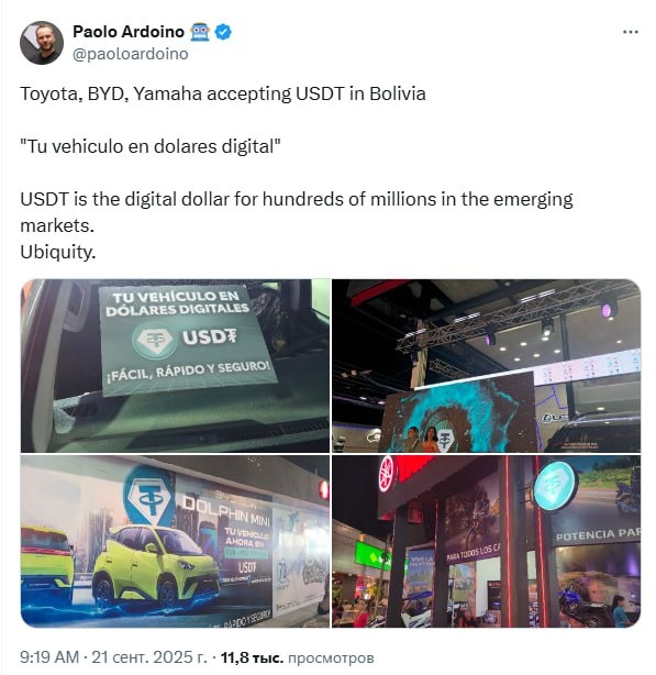 Toyota, BYD и Yamaha принимают USDT в Боливии «Ваш автомобиль за цифровые доллары» USDT — это цифровой доллар для сотен миллионов на развивающихся рынках. Повсеместно.