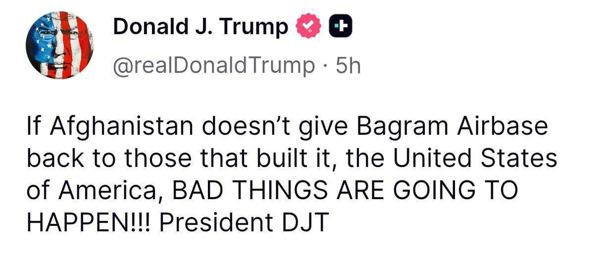 🚫Ультиматум Трампа «Талибану»: «Верните Баграм, или будут плохо